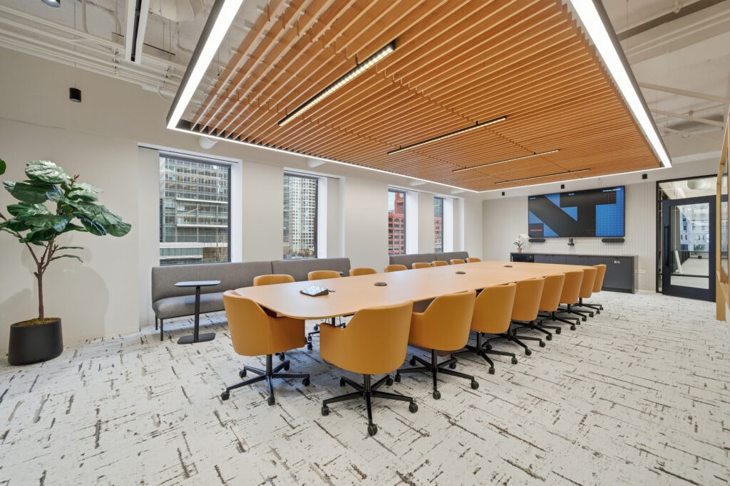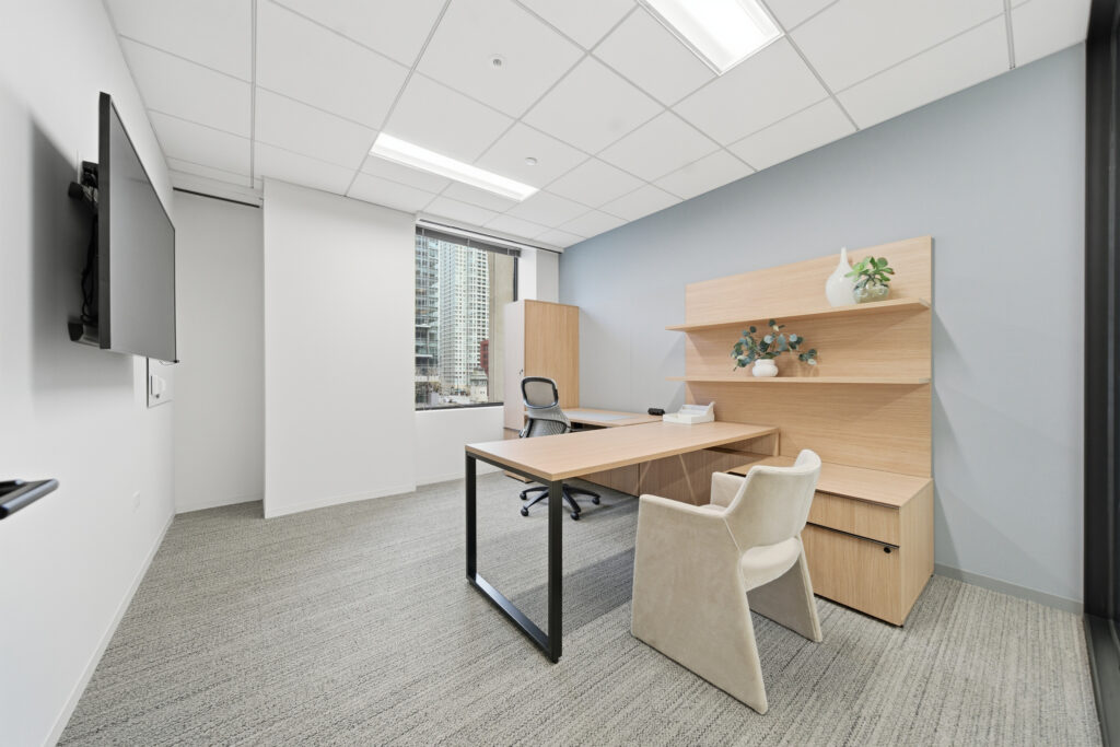 The space was thoughtfully planned with a minimalist modern aesthetic, blending clean lines, intentional layouts, and architectural character. Height-adjustable workstations support flexibility and ergonomics, while technology-forward meeting spaces enable seamless collaboration. Private phone rooms and enclosed areas provide security and quiet focus, balanced by open collaboration zones and inviting break areas that encourage connection. Natural light, expansive city views, and framed atrium sightlines enhance both function and visual impact.