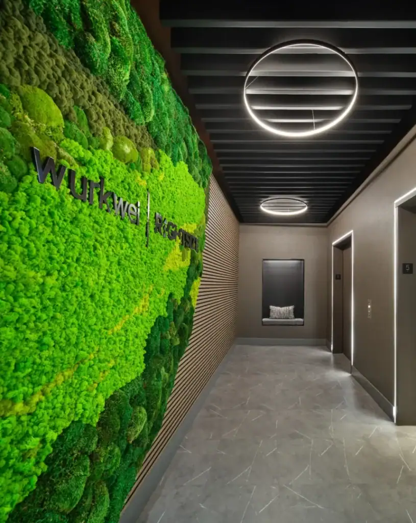 Nature is woven throughout the space. A striking curved moss wall evokes Earth’s organic shape. Tree-patterned lines on glass lead the visitor’s path. Living green walls and cloud-inspired acoustic panels soften transitions and elevate ambiance. The outcome? A place that feels alive, restorative, and intrinsically human.